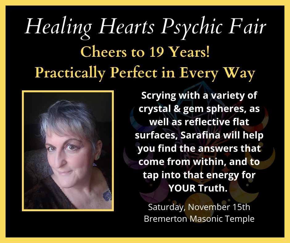 Established in 2007, the Healing Hearts Psychic Fair is an annual charity event organized by Chalice Hart to raise money for the Healing Hearts Fund. Chalice Hart is a 501(c)3 nonprofit organization, and the oldest and largest Wicca/Pagan group in Kitsap County.